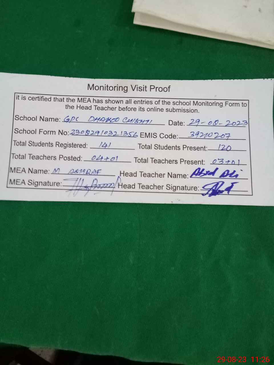 | Attendance Register | Head Teacher | MEA with School | Visit Proof |