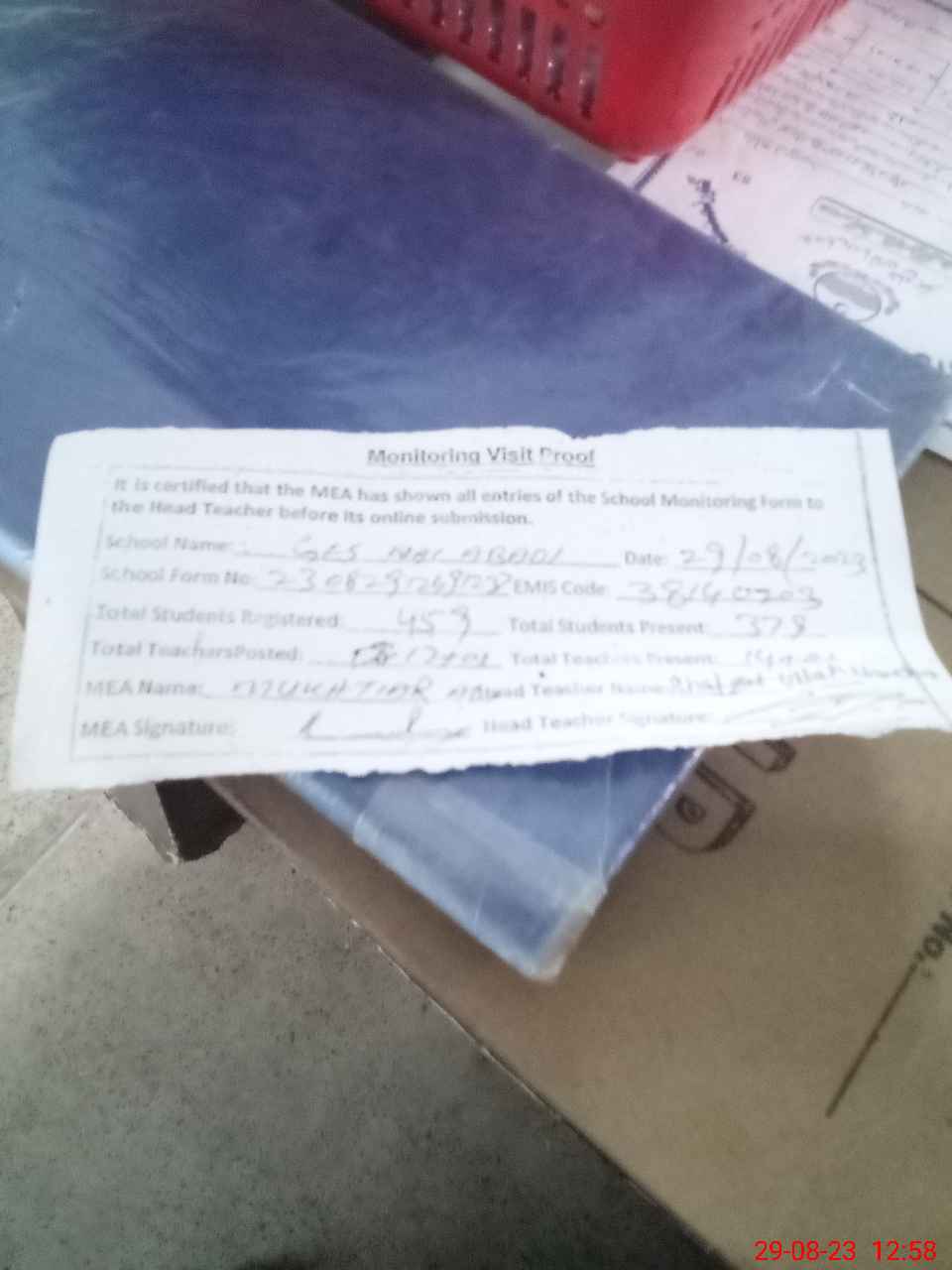 | Attendance Register | Head Teacher | MEA with School | Visit Proof |