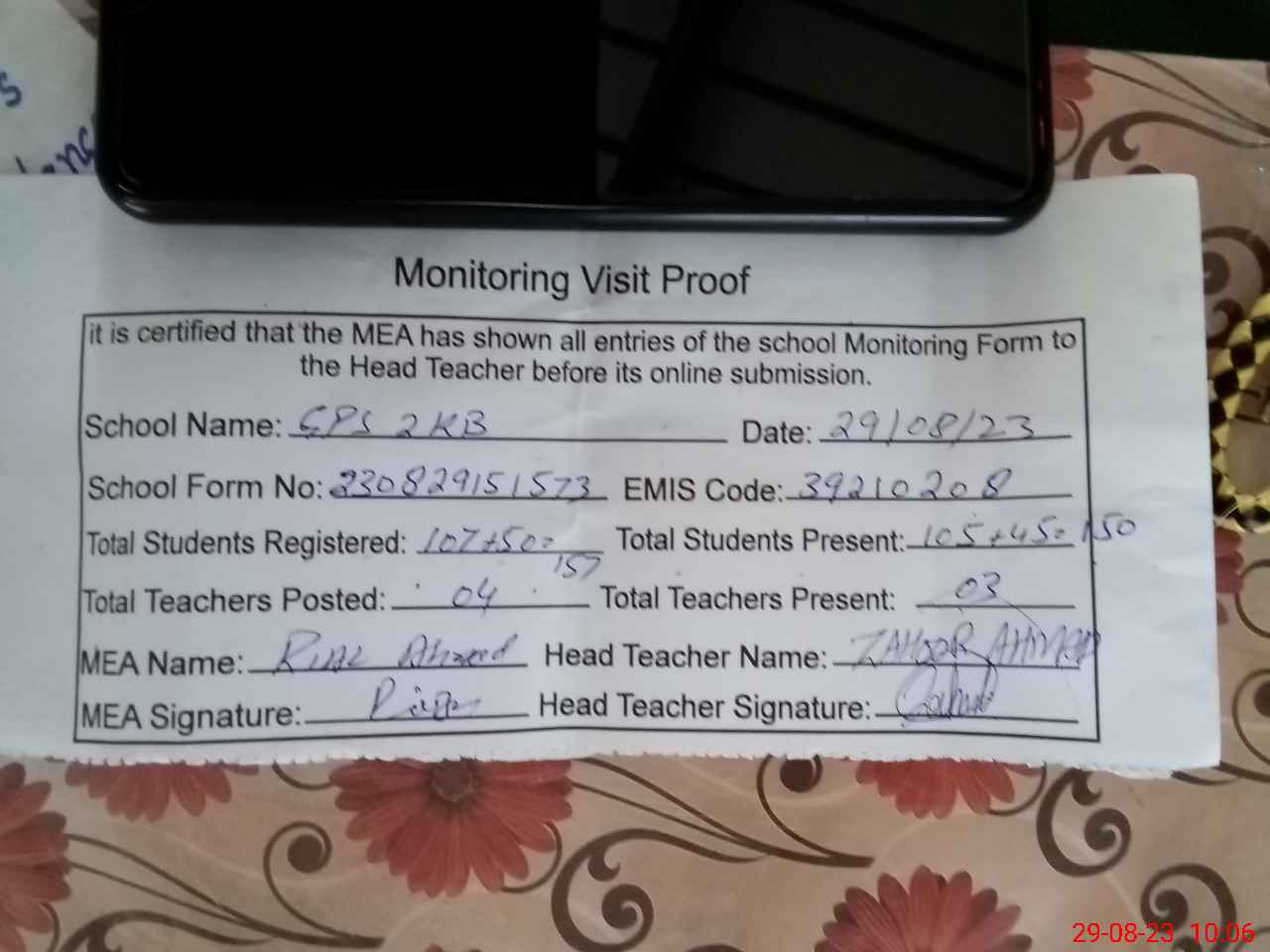 | Attendance Register | Head Teacher | MEA with School | Visit Proof |