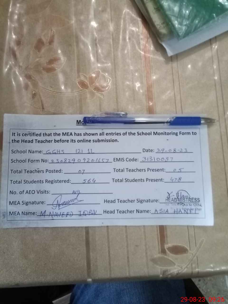 | Name: As**** Bi**** Designation: (School Headmaster's/Headmistress's) IC Head Mistress Phone/Cell Number: 03**** |