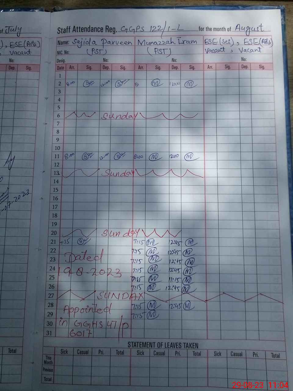 | Monitoring Date: 29-08-2023 | Start Time: 29-08-2023 10:24 AM | End Time: 29-08-2023 11:14 AM | Name of MEA: Mu**** Na**** Iq**** | |