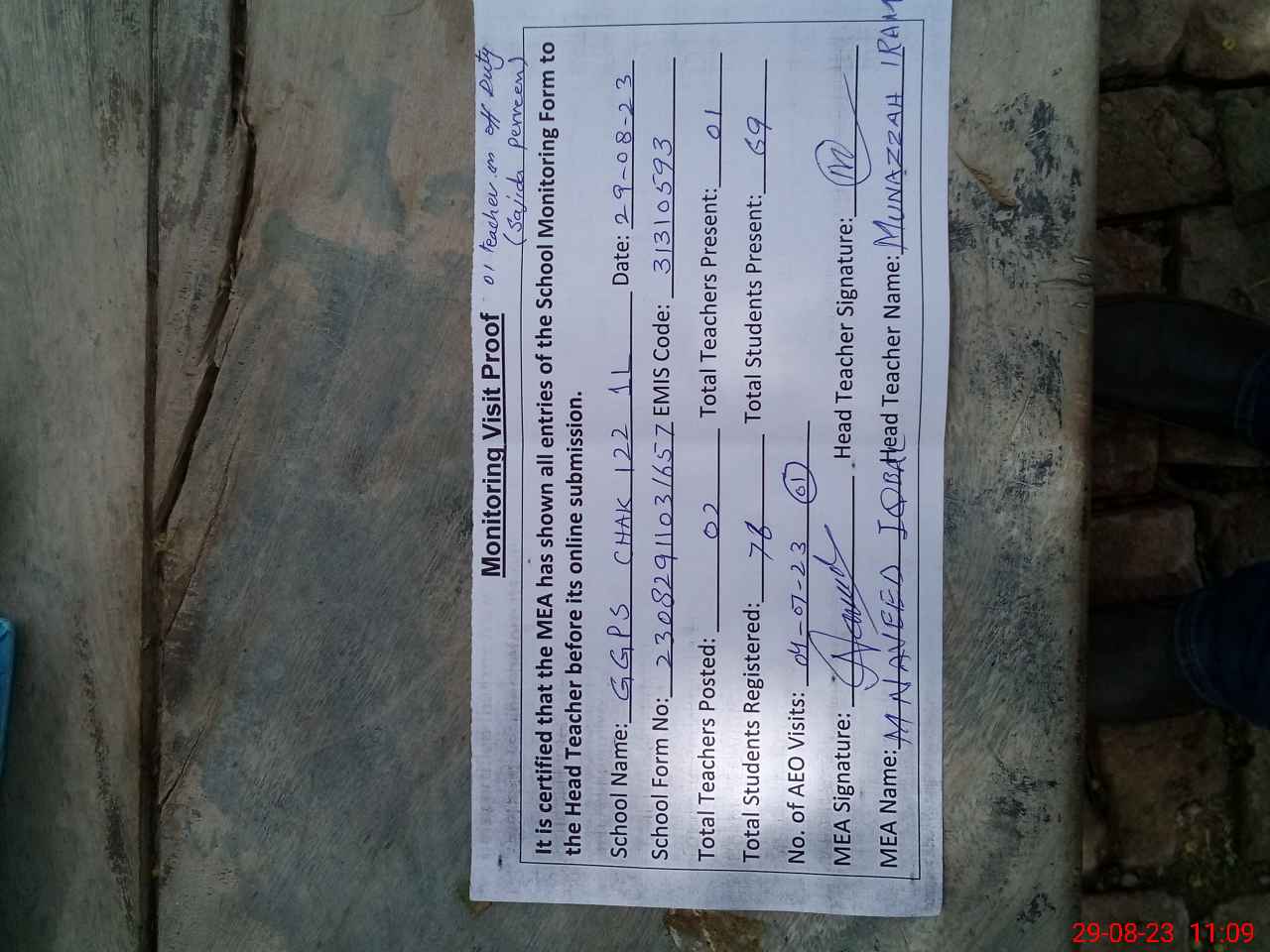 | Attendance Register | Head Teacher | MEA with School | Visit Proof |