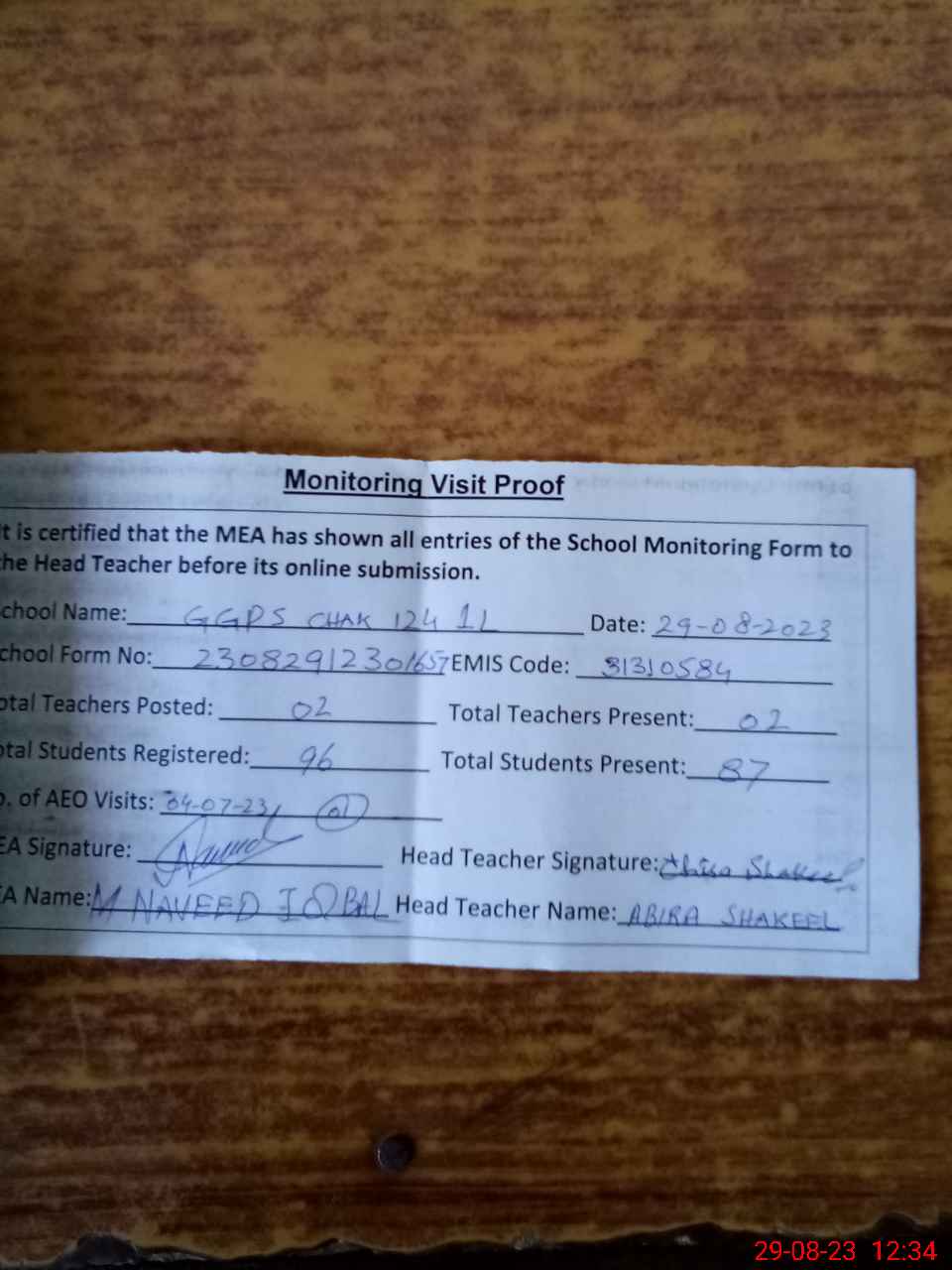 | Attendance Register | Head Teacher | MEA with School | Visit Proof |