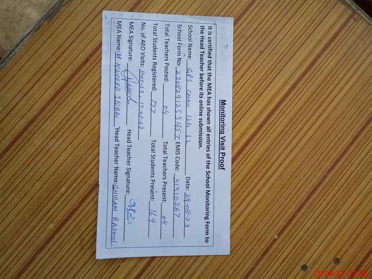 | EMIS Code: 31310267 | Name of School: GPS CHAK NO. 124/1-L | |||