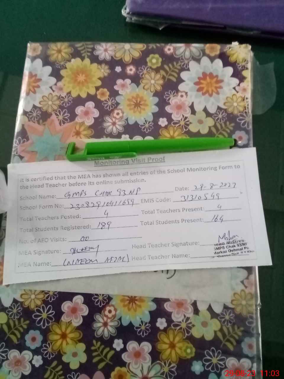 | Attendance Register | Head Teacher | MEA with School | Visit Proof |