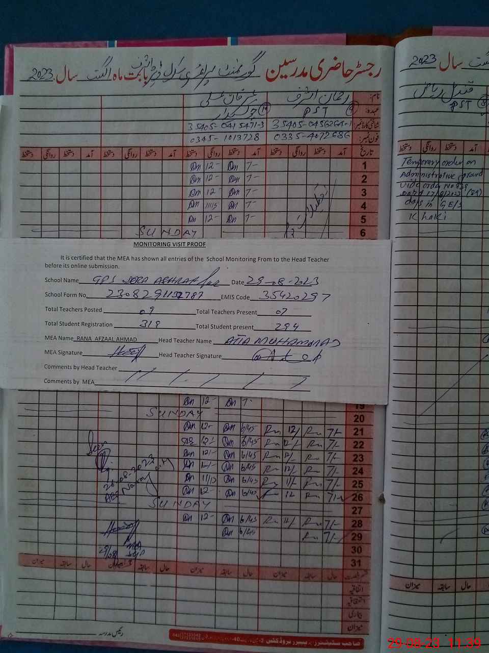 | Attendance Register | Head Teacher | MEA with School | Visit Proof |