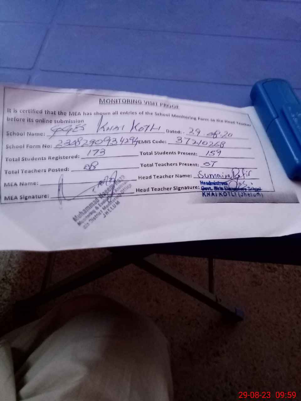 | Certified that this School was Inspected by the Undersigned MEA/DMO Today and the Information Stated Above is as Per Record. | |||||