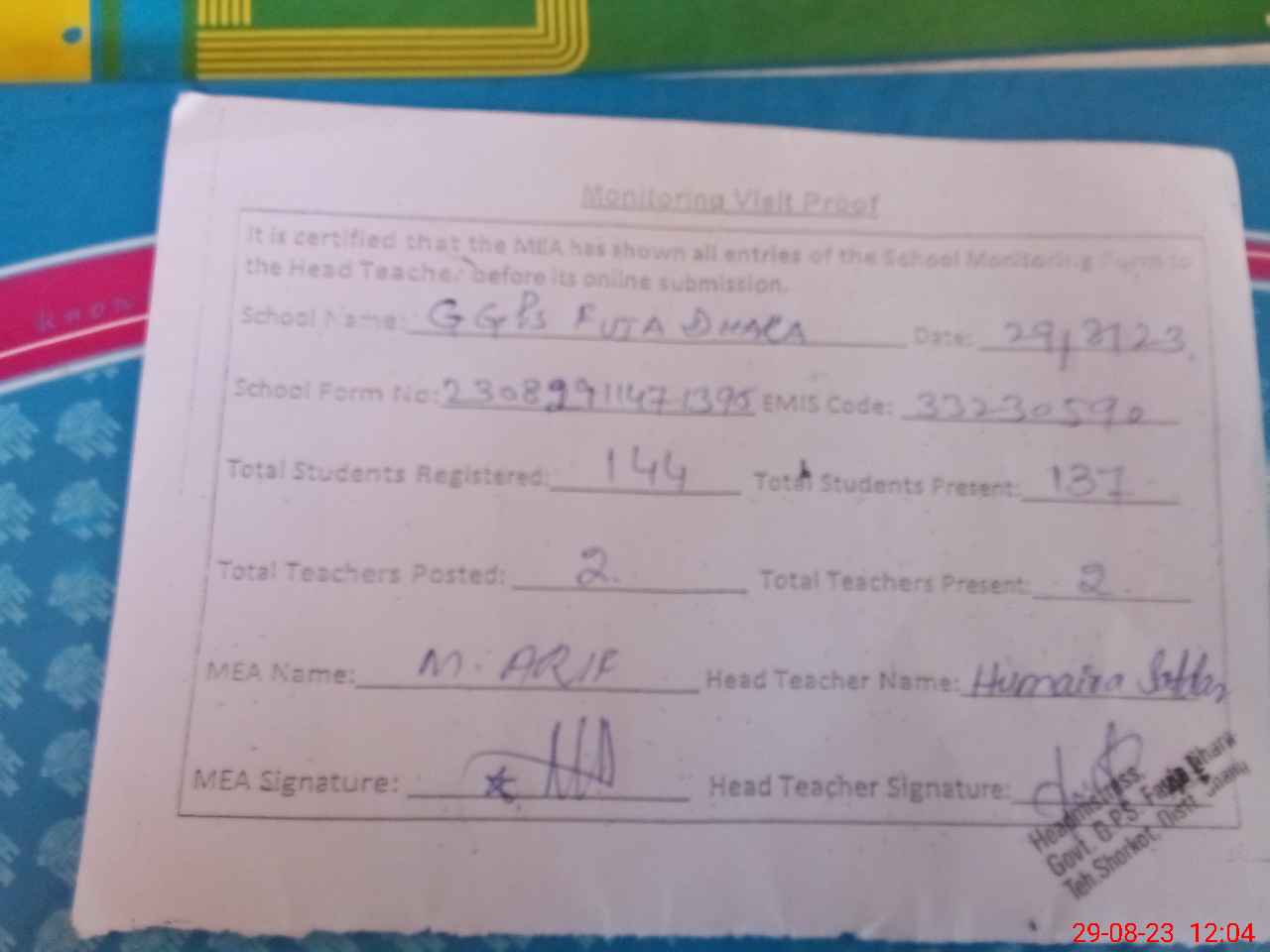 | Attendance Register | Head Teacher | MEA with School | Visit Proof |