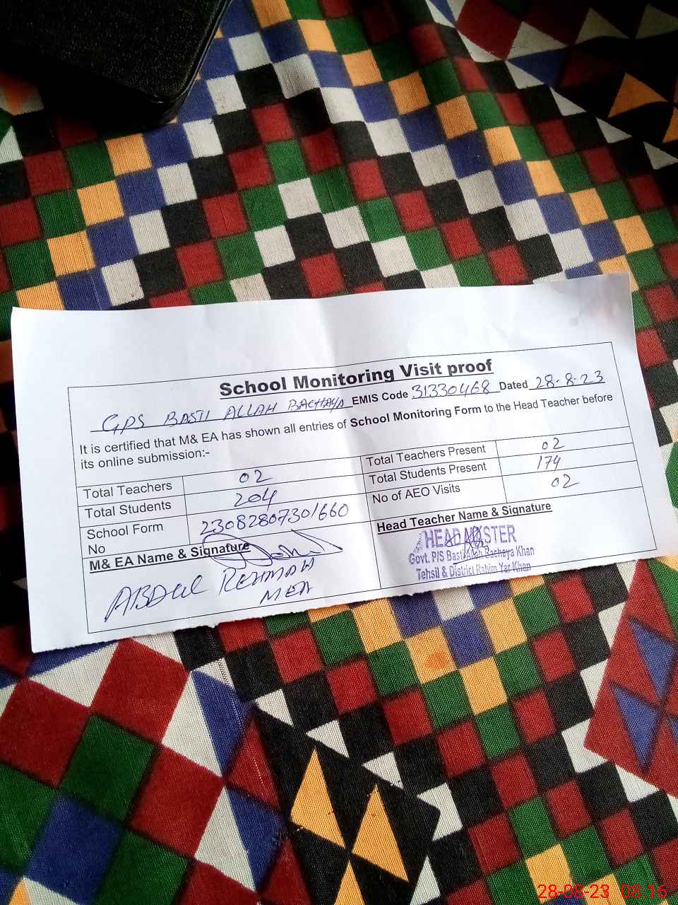 | Attendance Register | Head Teacher | MEA with School | Visit Proof |