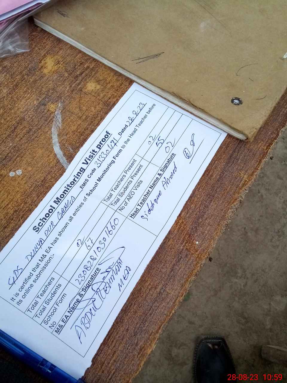 | Attendance Register | Head Teacher | MEA with School | Visit Proof |