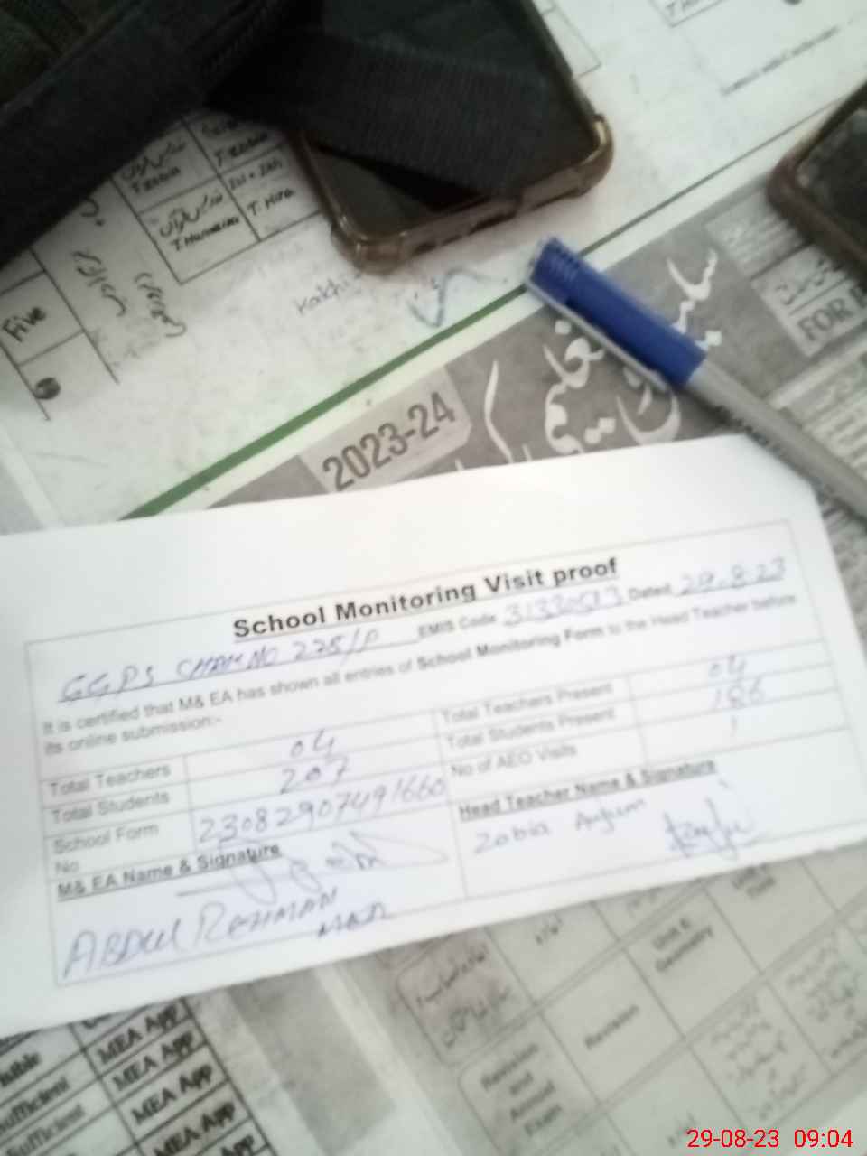 | Attendance Register | Head Teacher | MEA with School | Visit Proof |