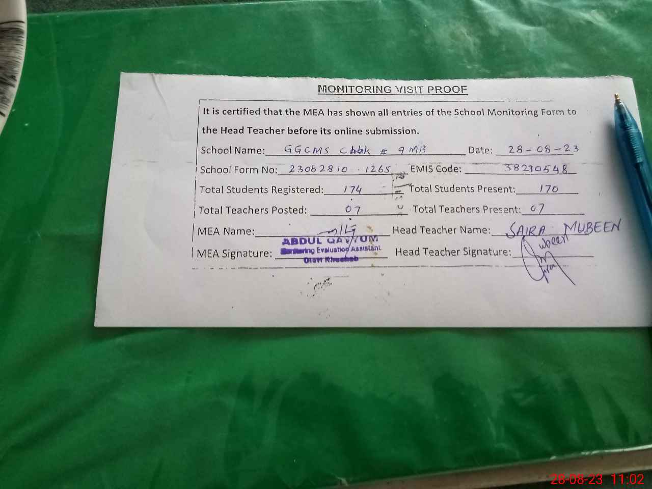 | EMIS Code: 38230548 | Name of School: GGCMS CHAK NO. 9 MB | |||