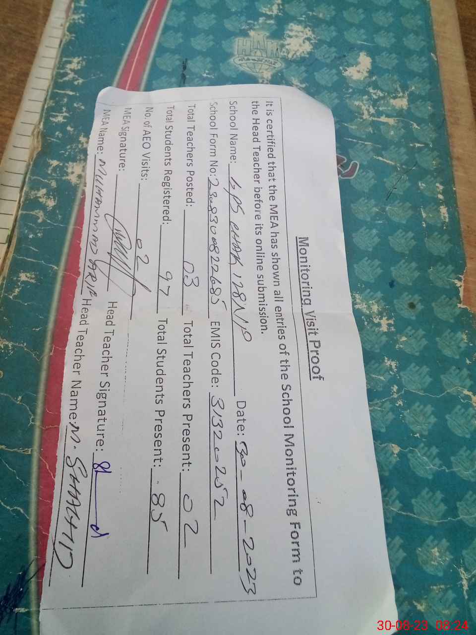 | Attendance Register | Head Teacher | MEA with School | Visit Proof |