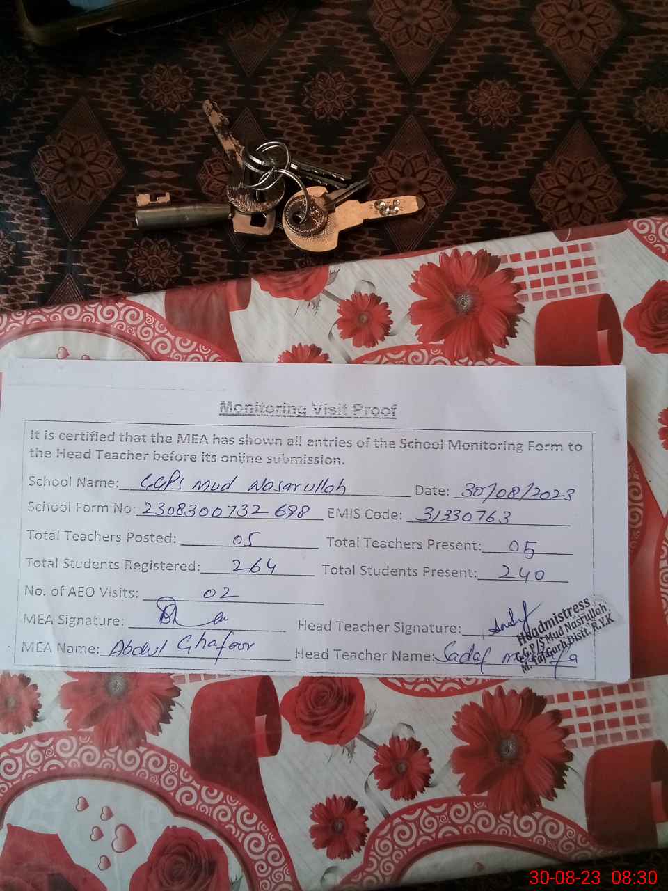 | Attendance Register | Head Teacher | MEA with School | Visit Proof |