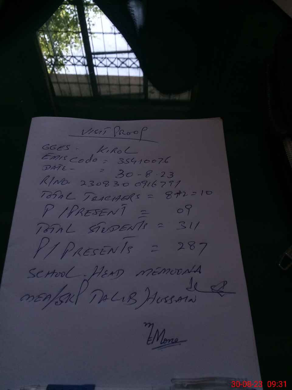 | Attendance Register | Head Teacher | MEA with School | Visit Proof |