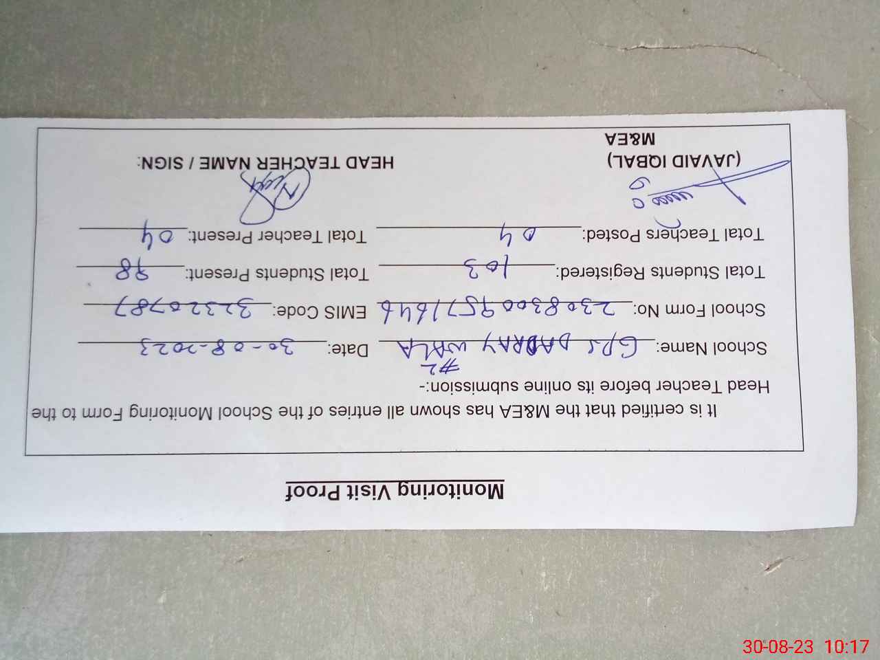 | Certified that this School was Inspected by the Undersigned MEA/DMO Today and the Information Stated Above is as Per Record. | |||||