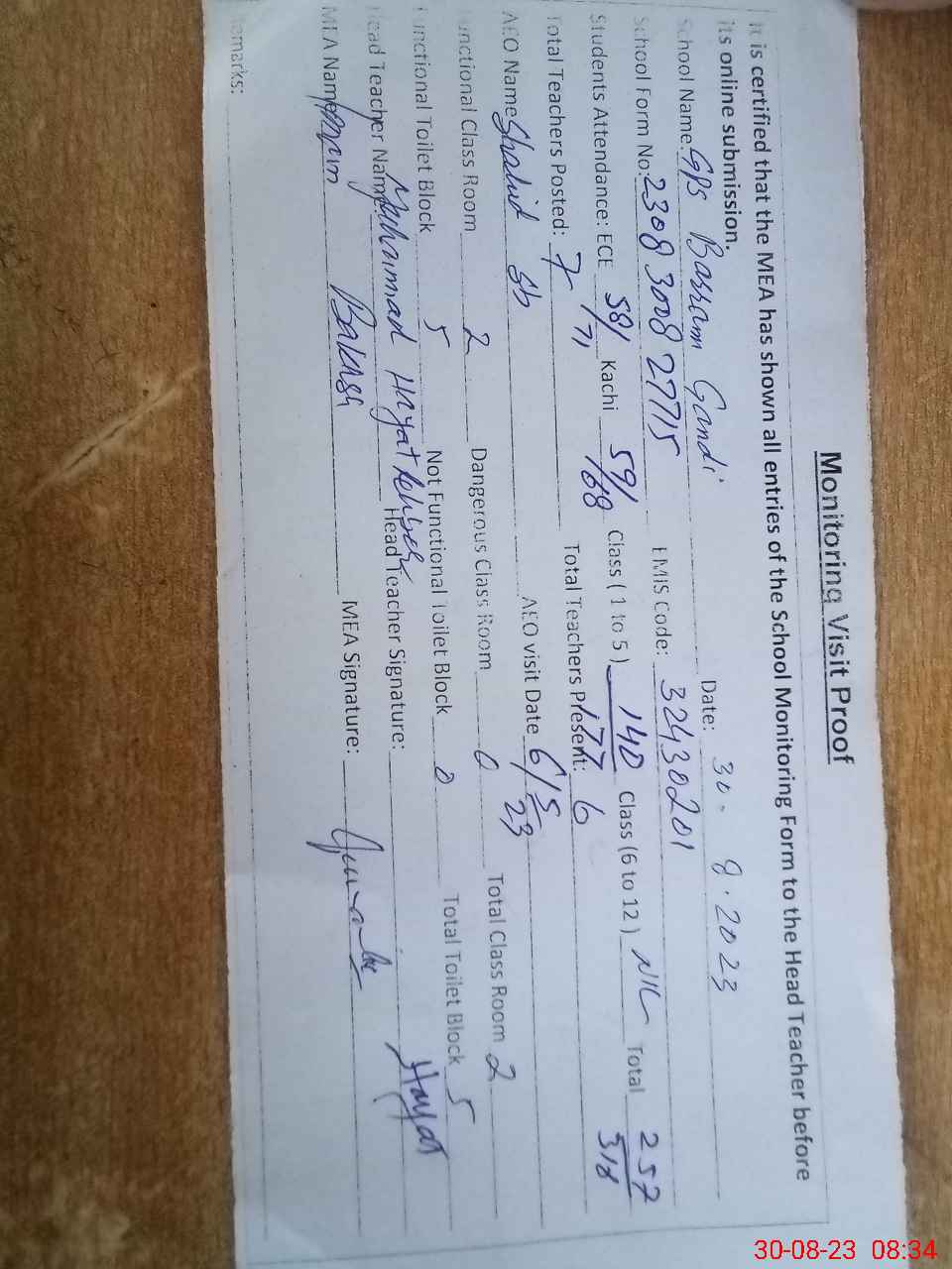 | Attendance Register | Head Teacher | MEA with School | Visit Proof |