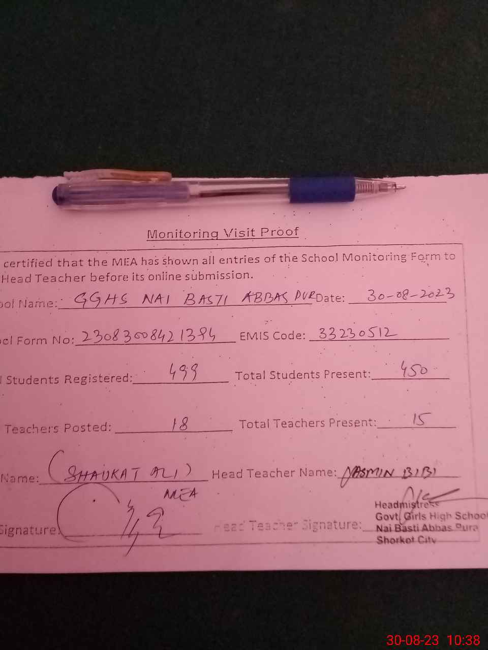 | Attendance Register | Head Teacher | MEA with School | Visit Proof |