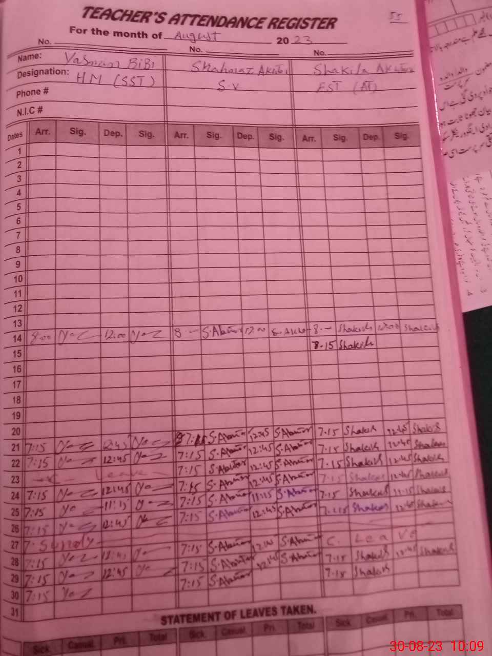 | Name: Ya**** Bi**** Designation: (School Headmaster's/Headmistress's) SSt Phone/Cell Number: 03**** |