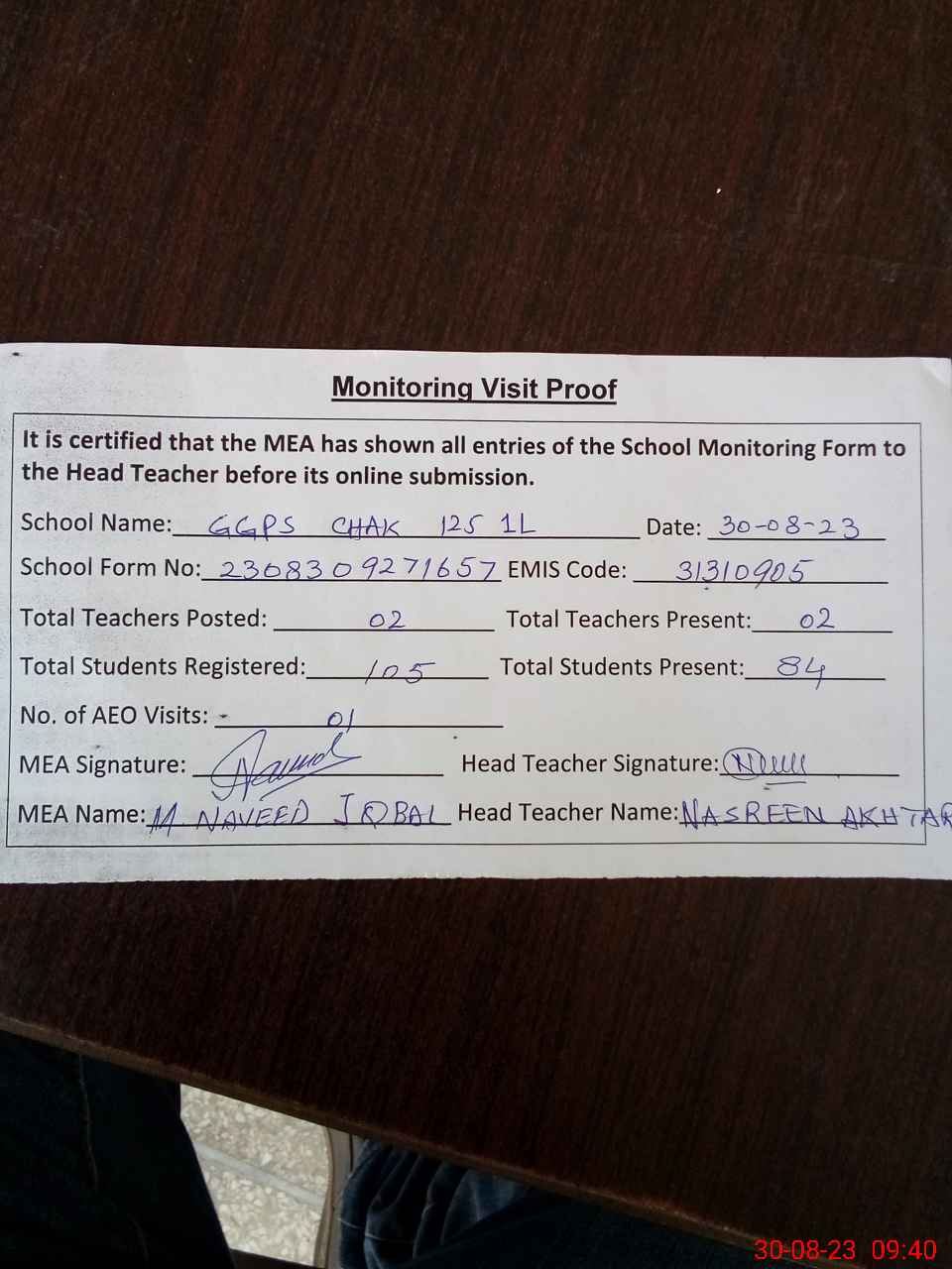 | Certified that this School was Inspected by the Undersigned MEA/DMO Today and the Information Stated Above is as Per Record. | |||||