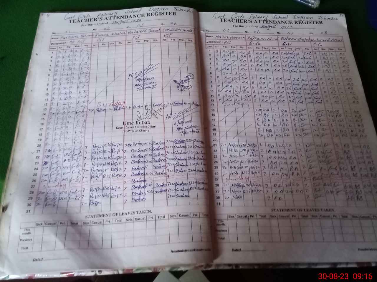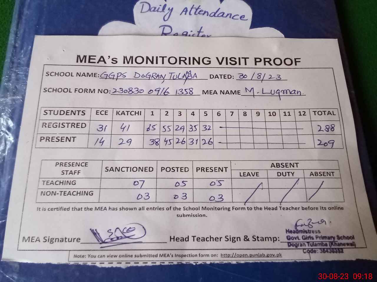 | Attendance Register | Head Teacher | MEA with School | Visit Proof |