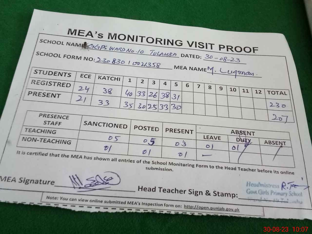 | Attendance Register | Head Teacher | MEA with School | Visit Proof |