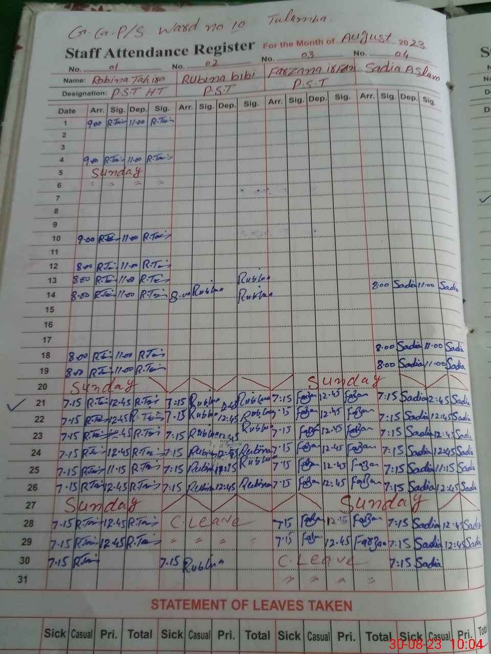 | Leave | Duty | Absent | Maternity | Medical | Ex- Pak |