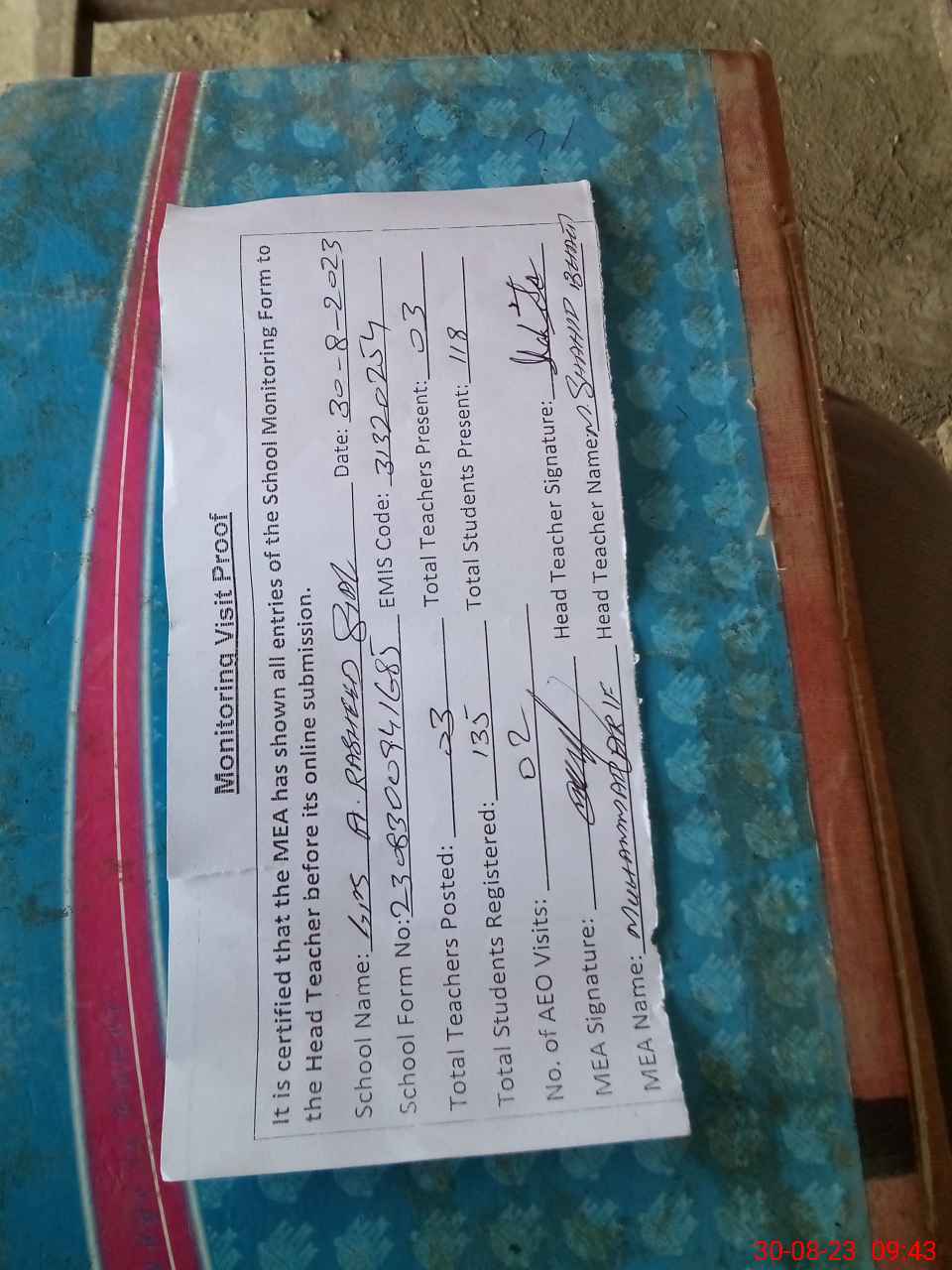 | Attendance Register | Head Teacher | MEA with School | Visit Proof |