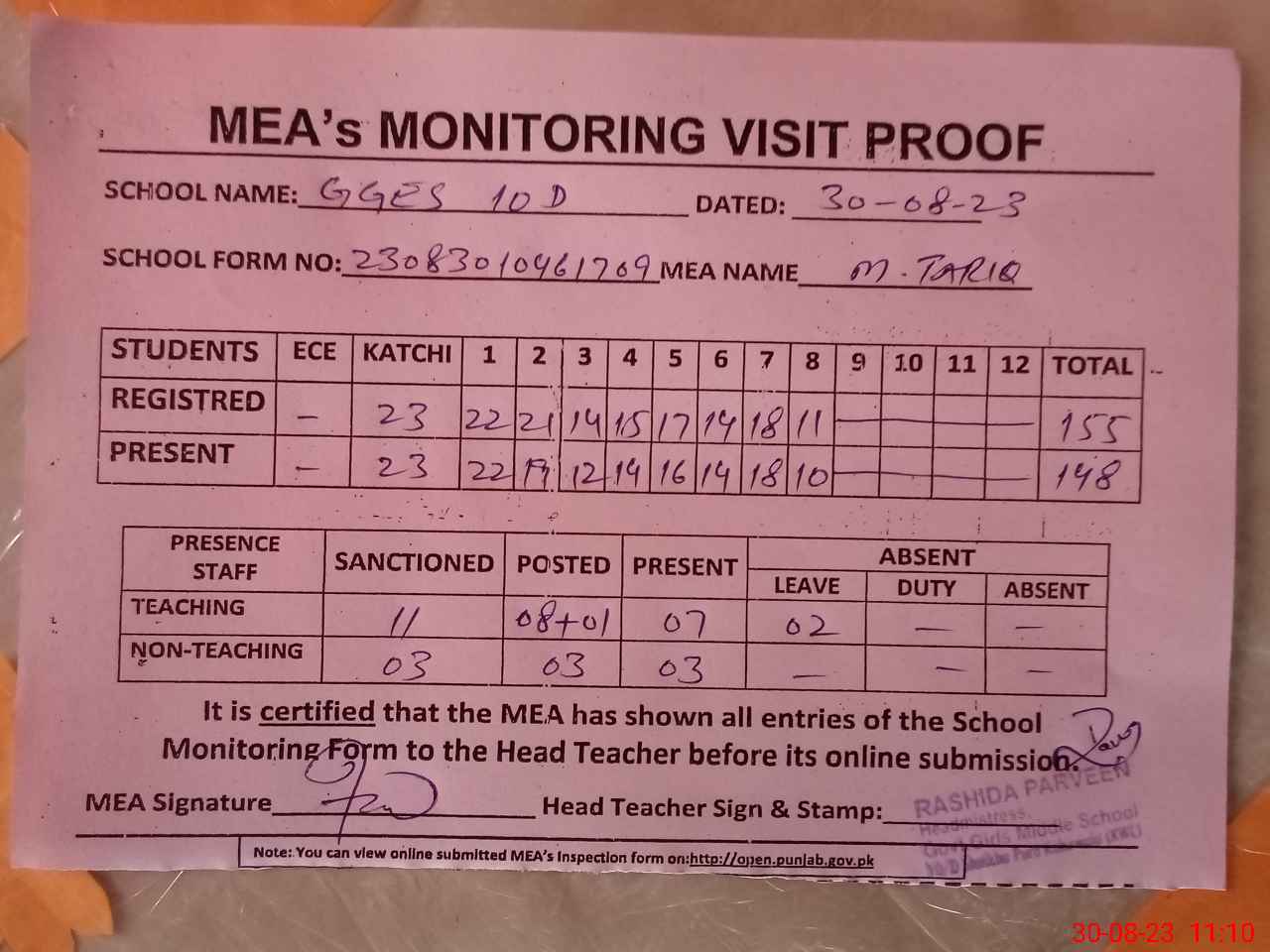 | Attendance Register | Head Teacher | MEA with School | Visit Proof |
