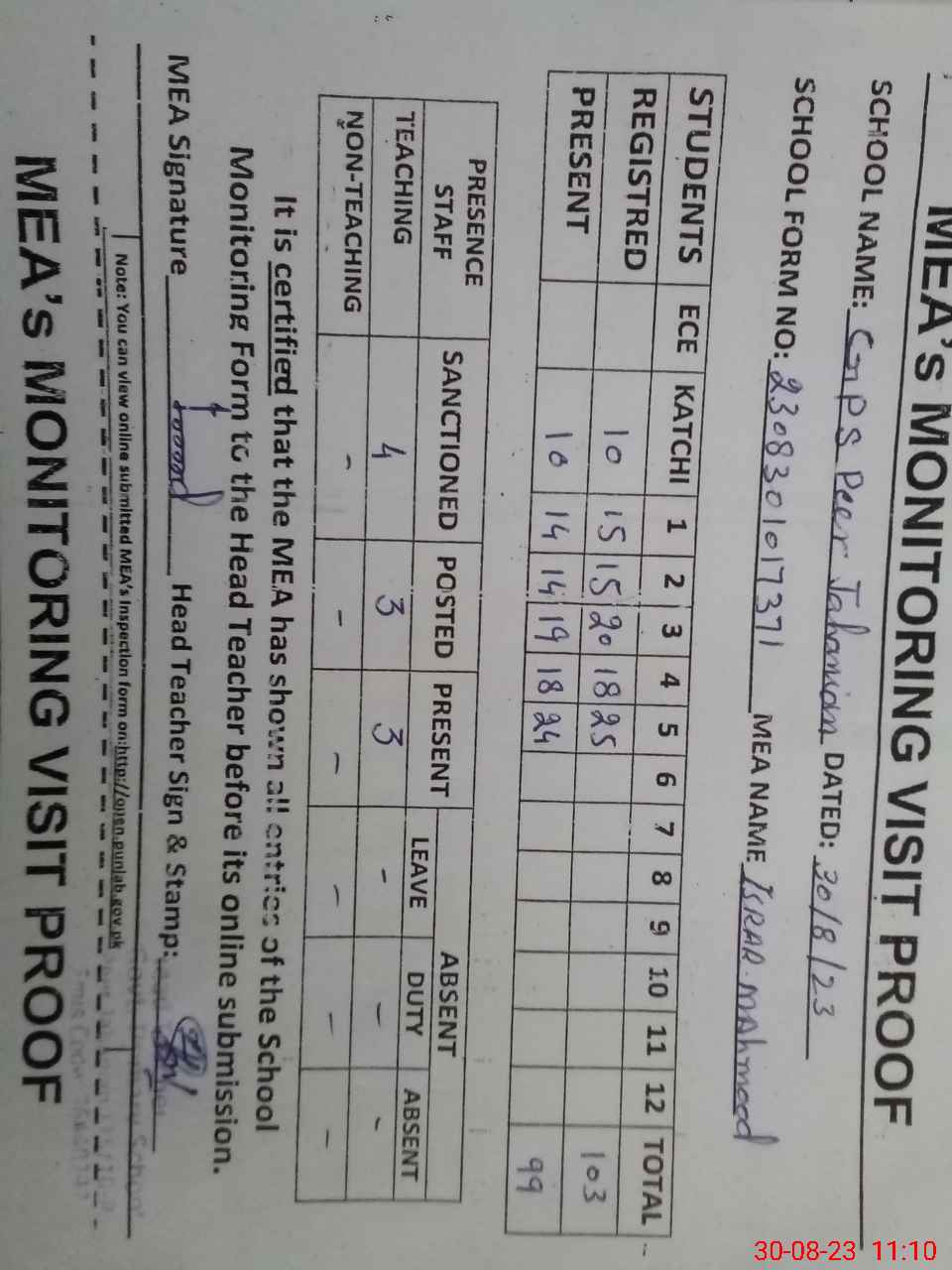 | Attendance Register | Head Teacher | MEA with School | Visit Proof |