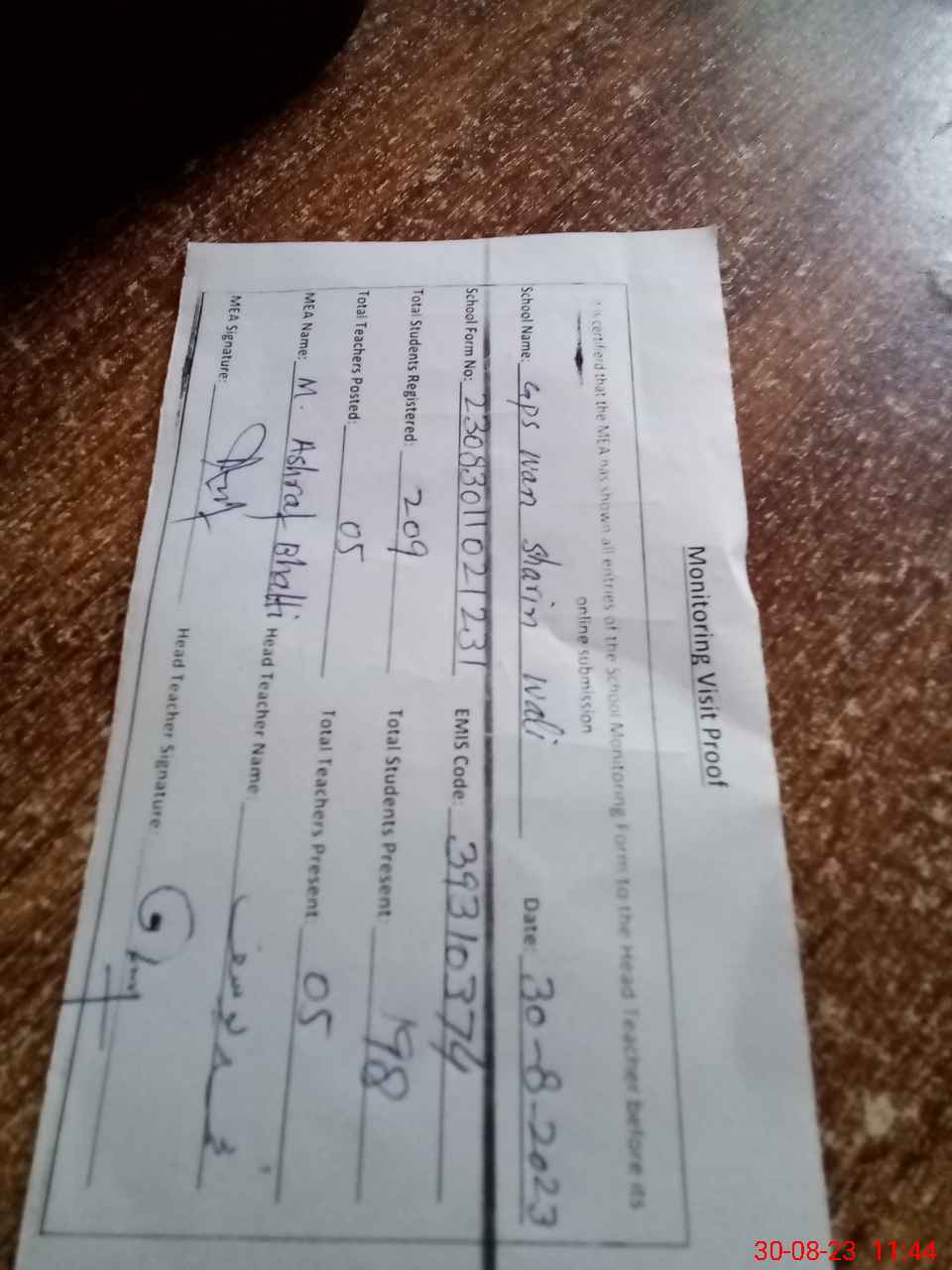 | Attendance Register | Head Teacher | MEA with School | Visit Proof |