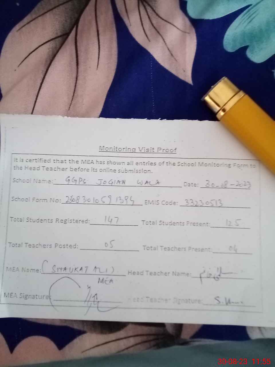 | Attendance Register | Head Teacher | MEA with School | Visit Proof |