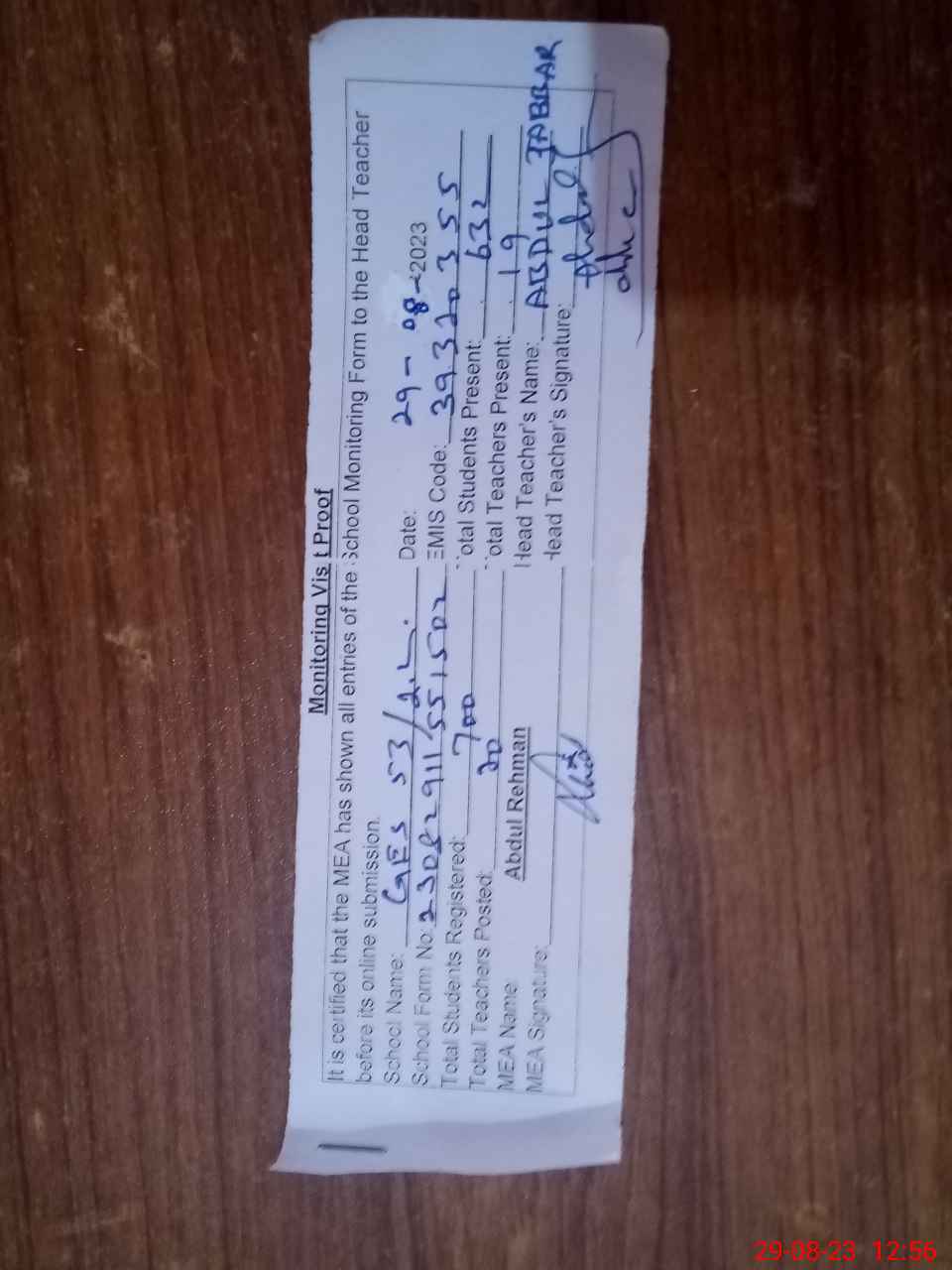 | Attendance Register | Head Teacher | MEA with School | Visit Proof |