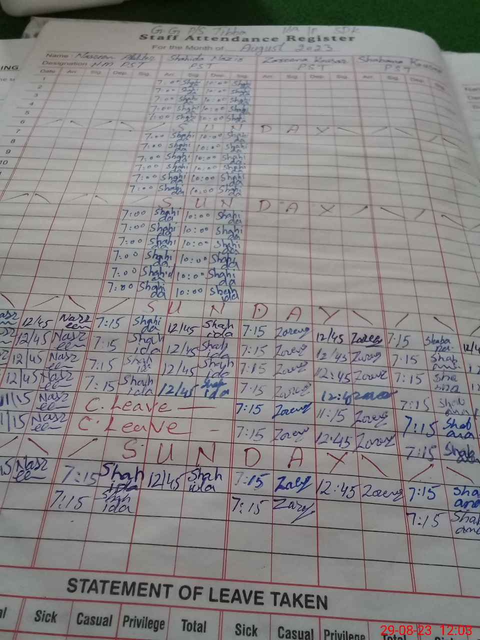 | CNIC | Full Name | Designation | R/C | Absence During Last Calender Month |