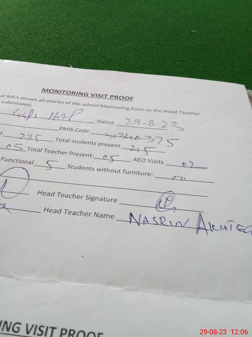 | Attendance Register | Head Teacher | MEA with School | Visit Proof |