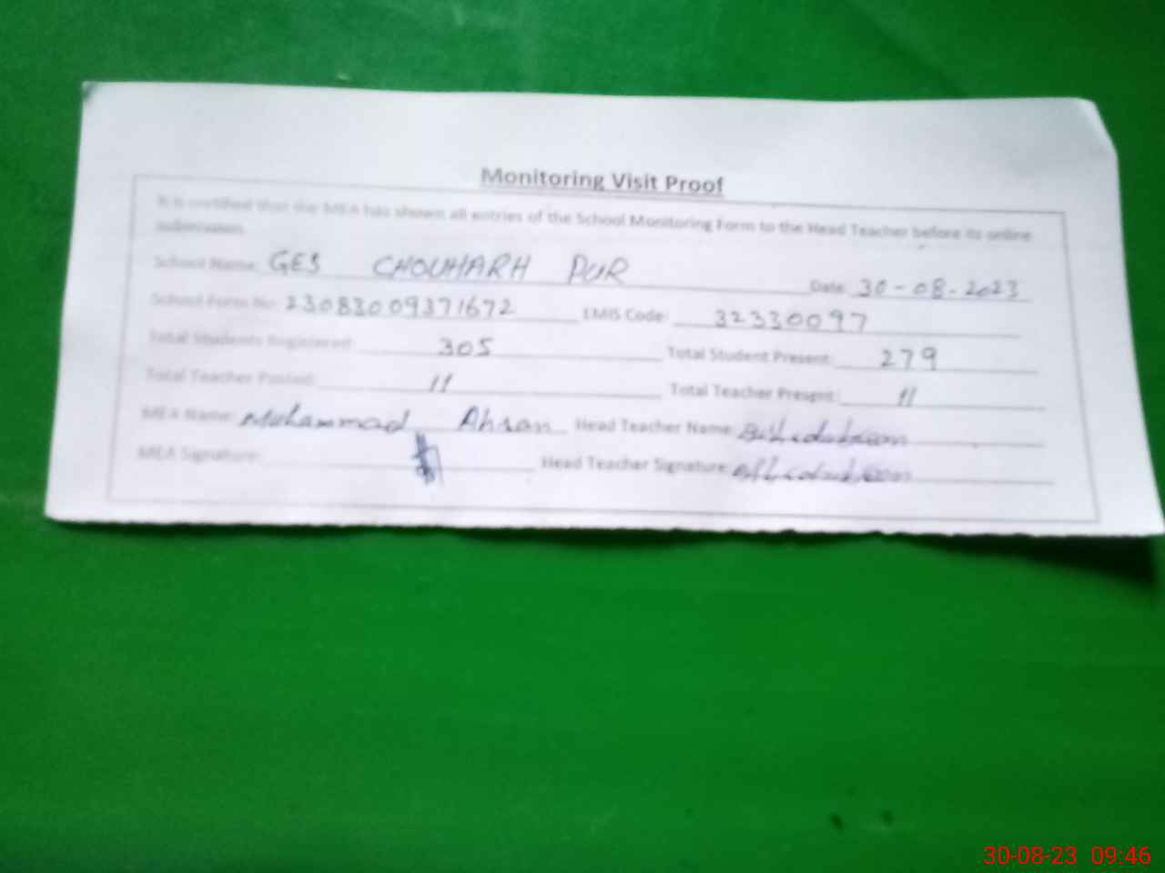 | Attendance Register | Head Teacher | MEA with School | Visit Proof |