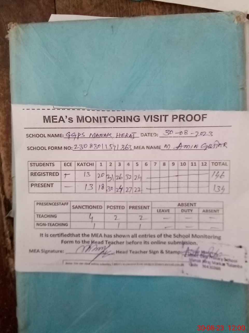 | Attendance Register | Head Teacher | MEA with School | Visit Proof |