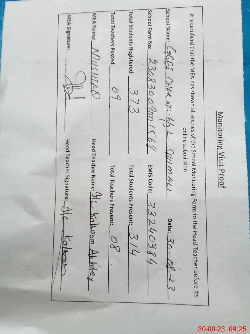 | EMIS Code: 33240384 | Name of School: GGES CHAK NO 6/3L SHUMALI | |||