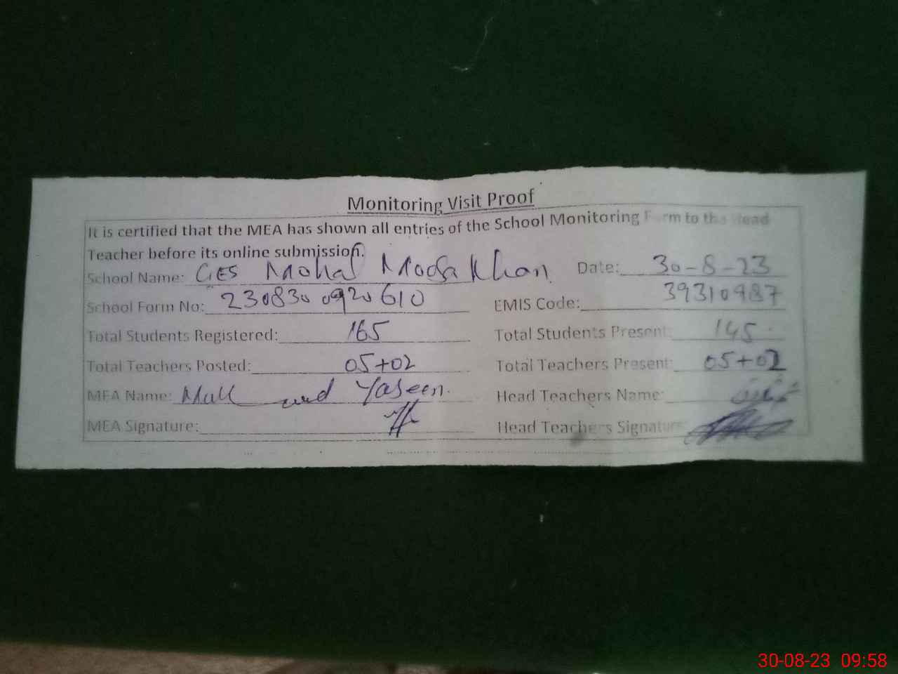 | Attendance Register | Head Teacher | MEA with School | Visit Proof |