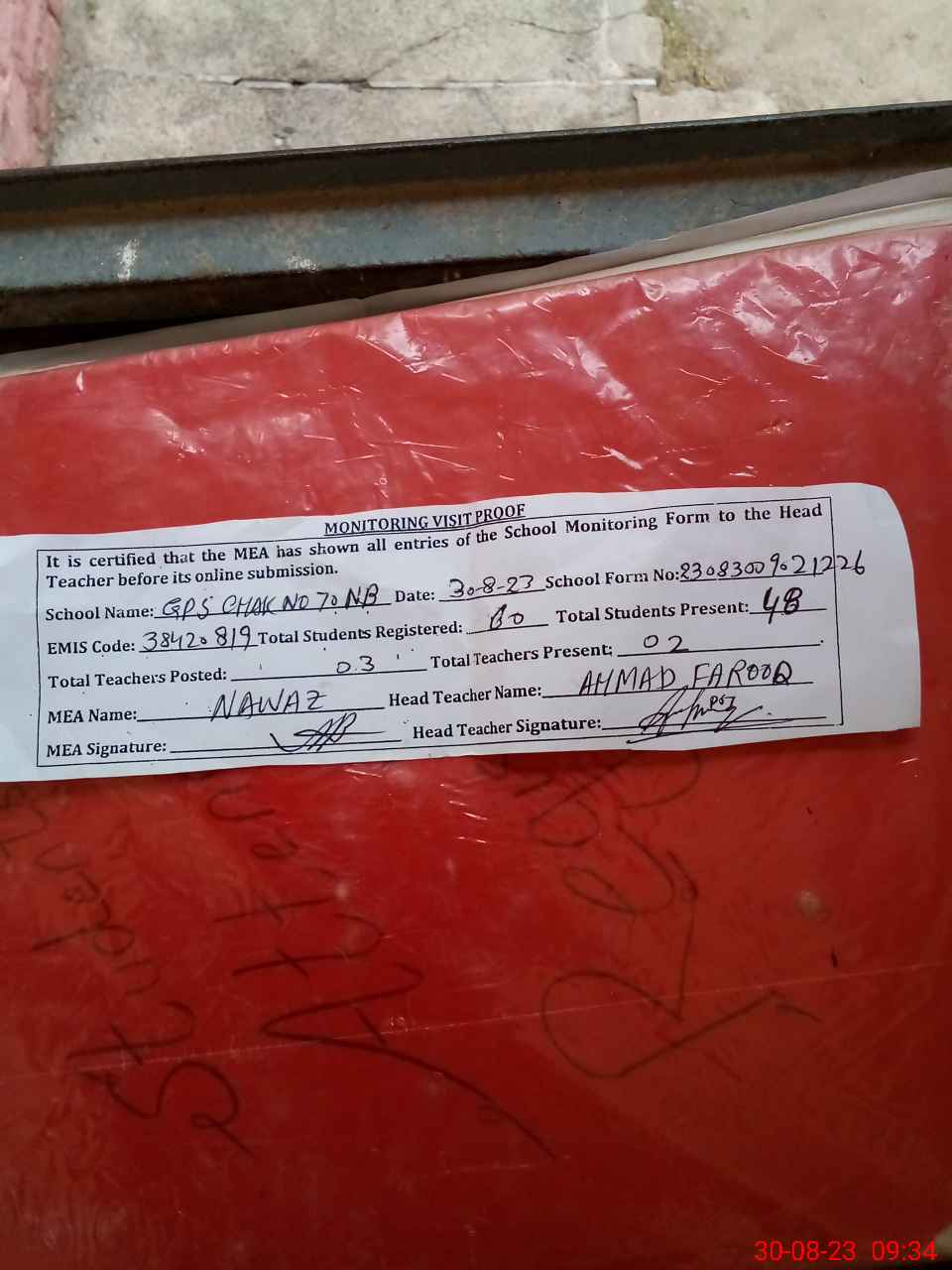 | Attendance Register | Head Teacher | MEA with School | Visit Proof |