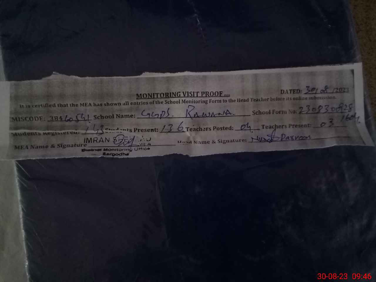 | Monitoring Date: 30-08-2023 | Start Time: 30-08-2023 09:28 AM | End Time: 30-08-2023 09:47 AM | Name of MEA: IM**** SH**** | |