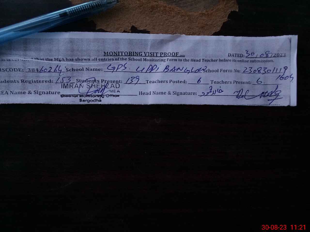 | Attendance Register | Head Teacher | MEA with School | Visit Proof |
