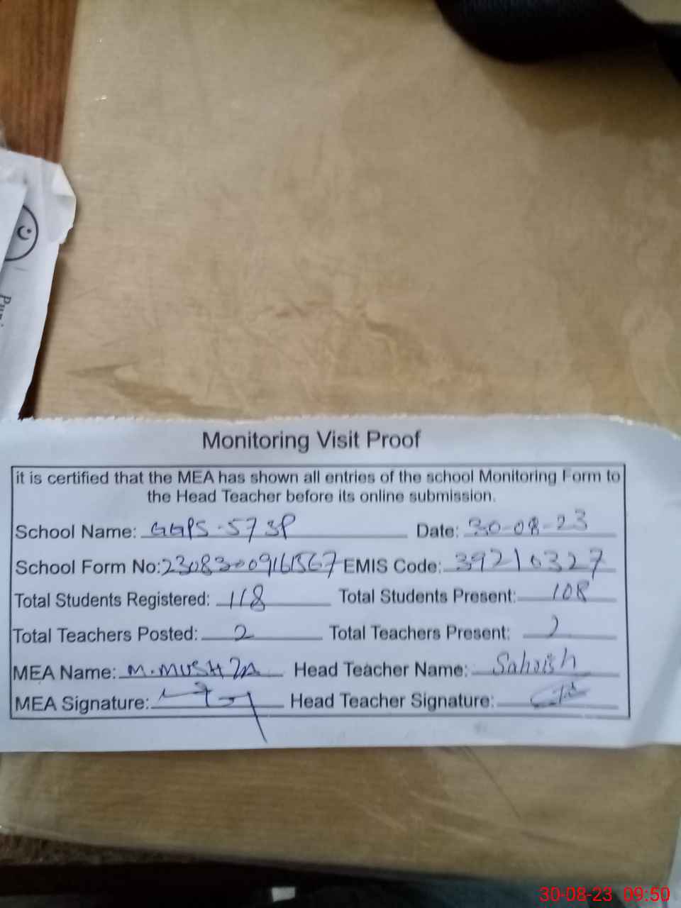 | Attendance Register | Head Teacher | MEA with School | Visit Proof |