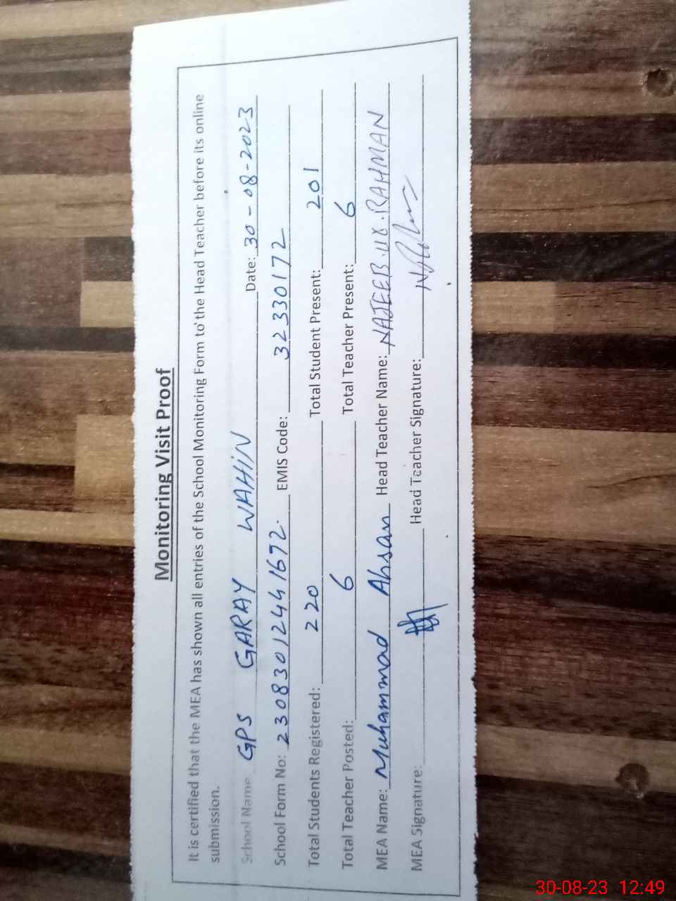 | Attendance Register | Head Teacher | MEA with School | Visit Proof |