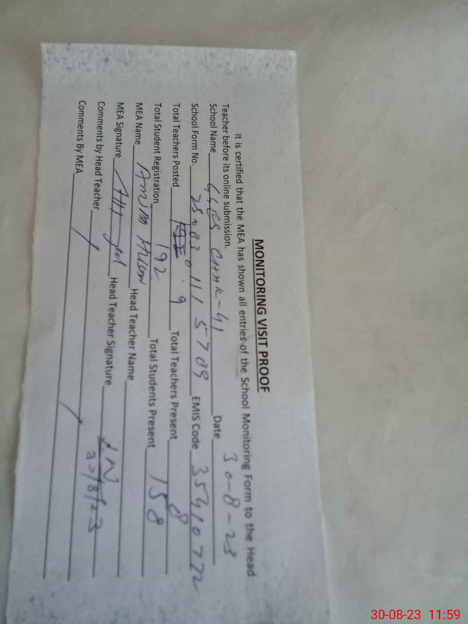 | Attendance Register | Head Teacher | MEA with School | Visit Proof |