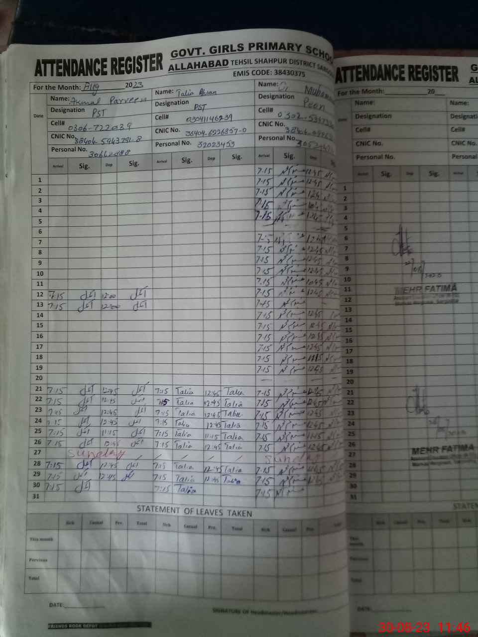 | Name: AK**** PA**** Designation: (School Headmaster's/Headmistress's) PST Phone/Cell Number: 03**** |