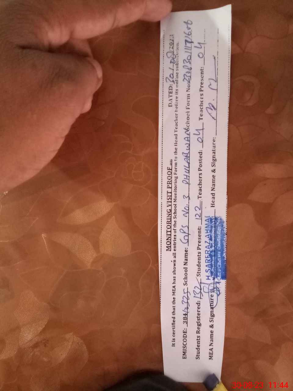 | Attendance Register | Head Teacher | MEA with School | Visit Proof |