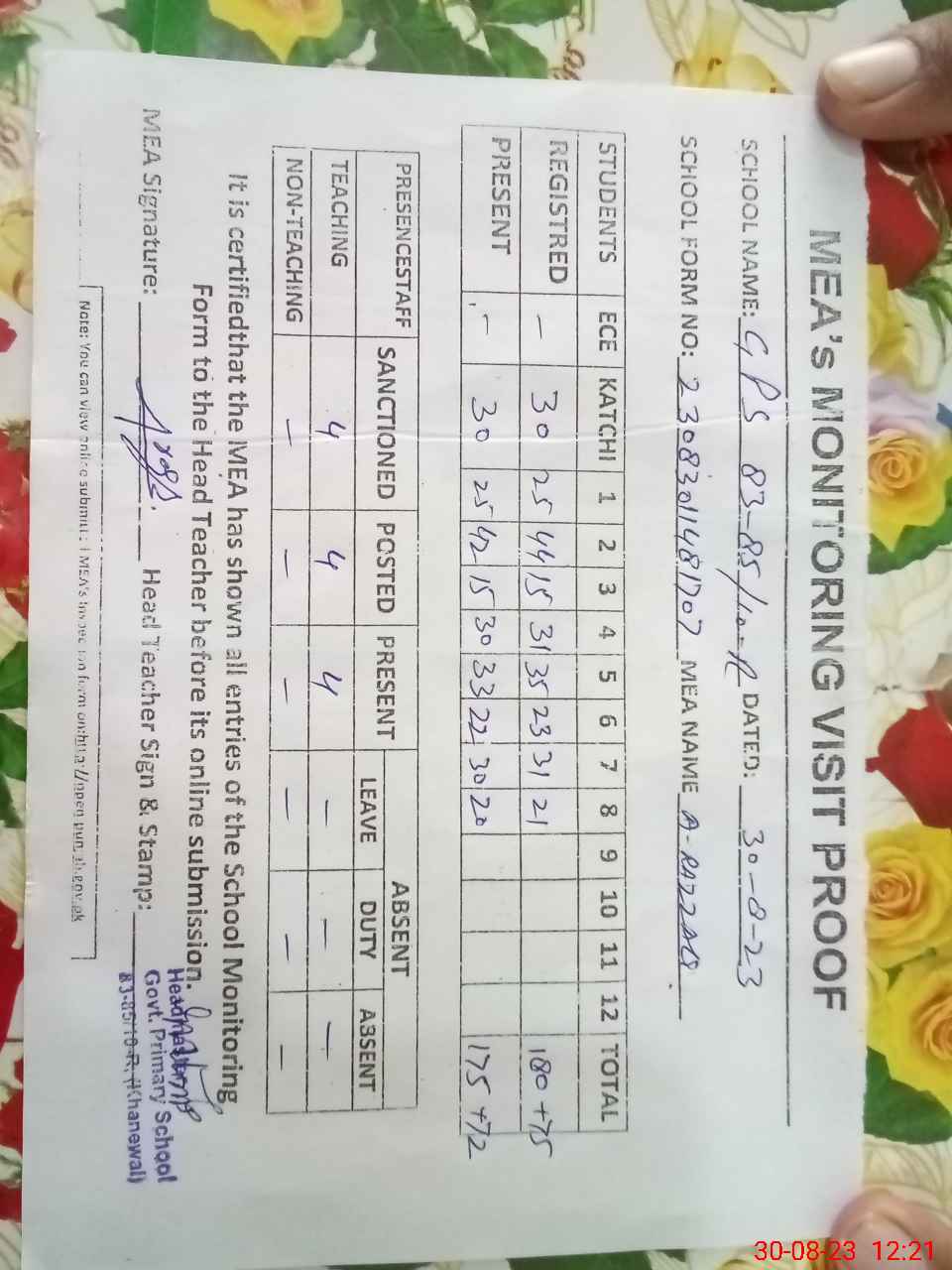 | Attendance Register | Head Teacher | MEA with School | Visit Proof |