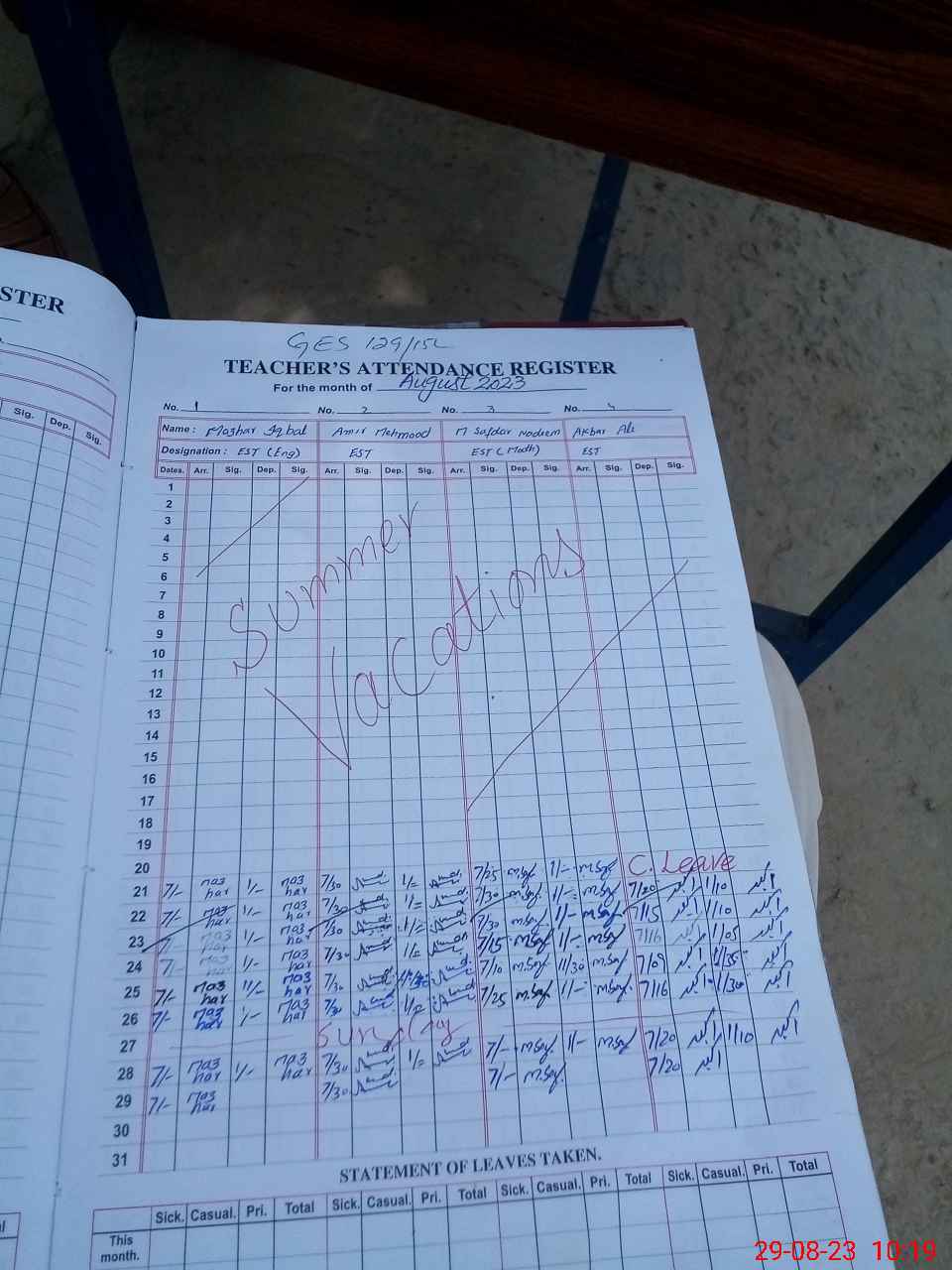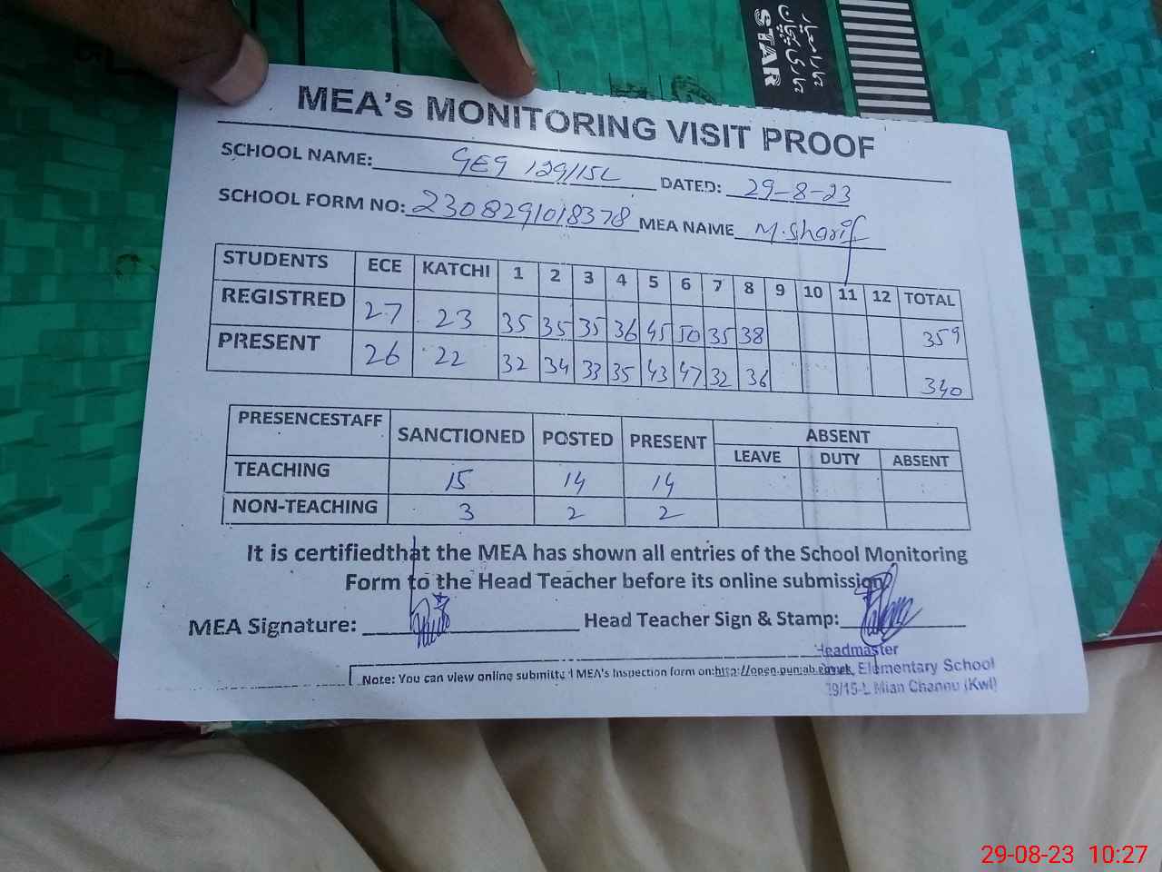 | Attendance Register | Head Teacher | MEA with School | Visit Proof |