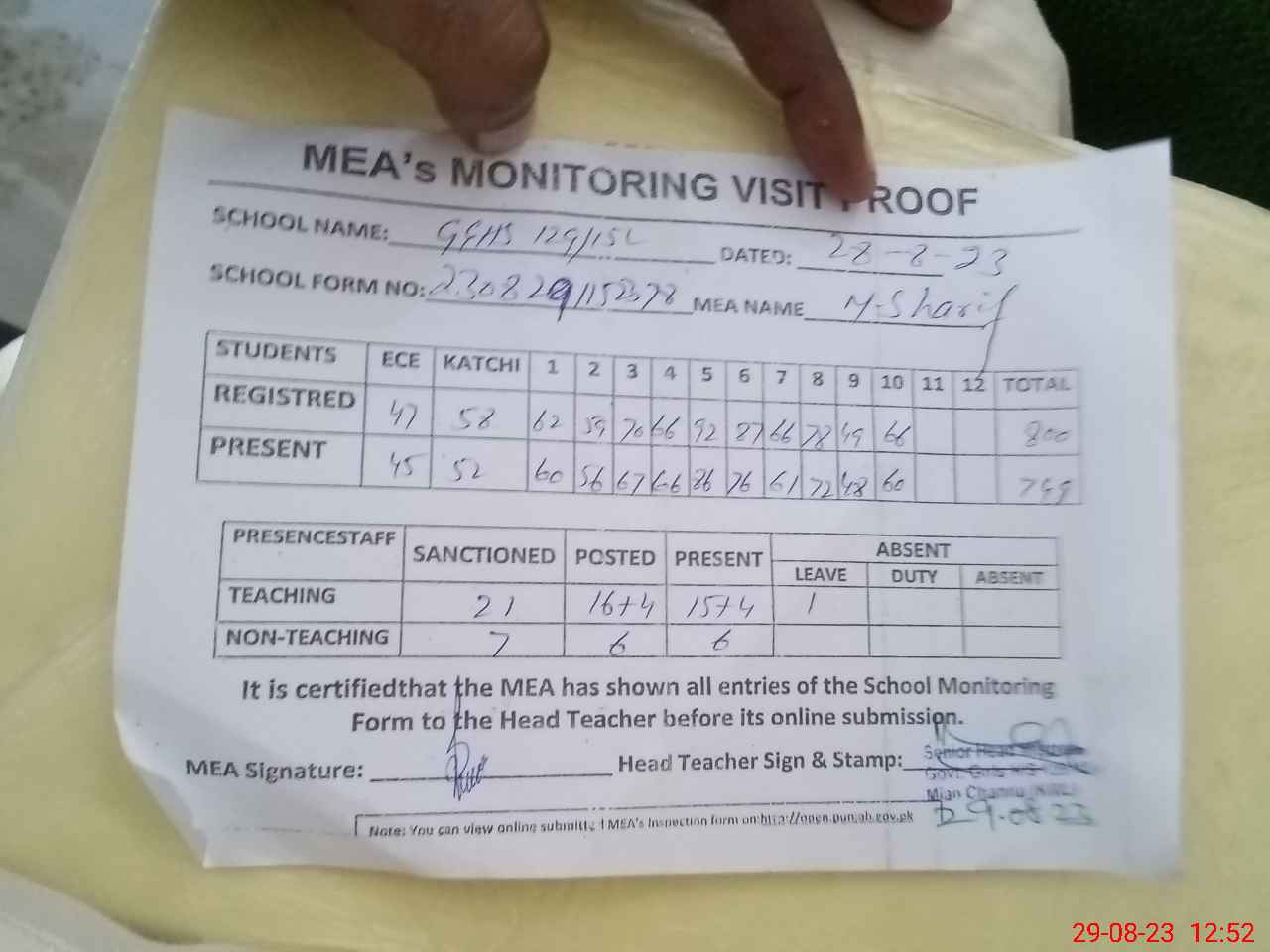 | EMIS Code: 36430042 | Name of School: GGHS 129/15-L, MIAN CHANNU | |||